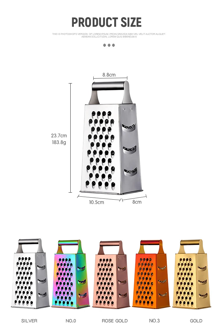 Effortlessly slice and grate fresh fruits and vegetables with our multi-functional cutter. With its gold-plated design and durable construction, this kitchen tool will add style and efficiency to your cooking. Say goodbye to tedious food prep and hello to delicious, perfectly cut produce every time.