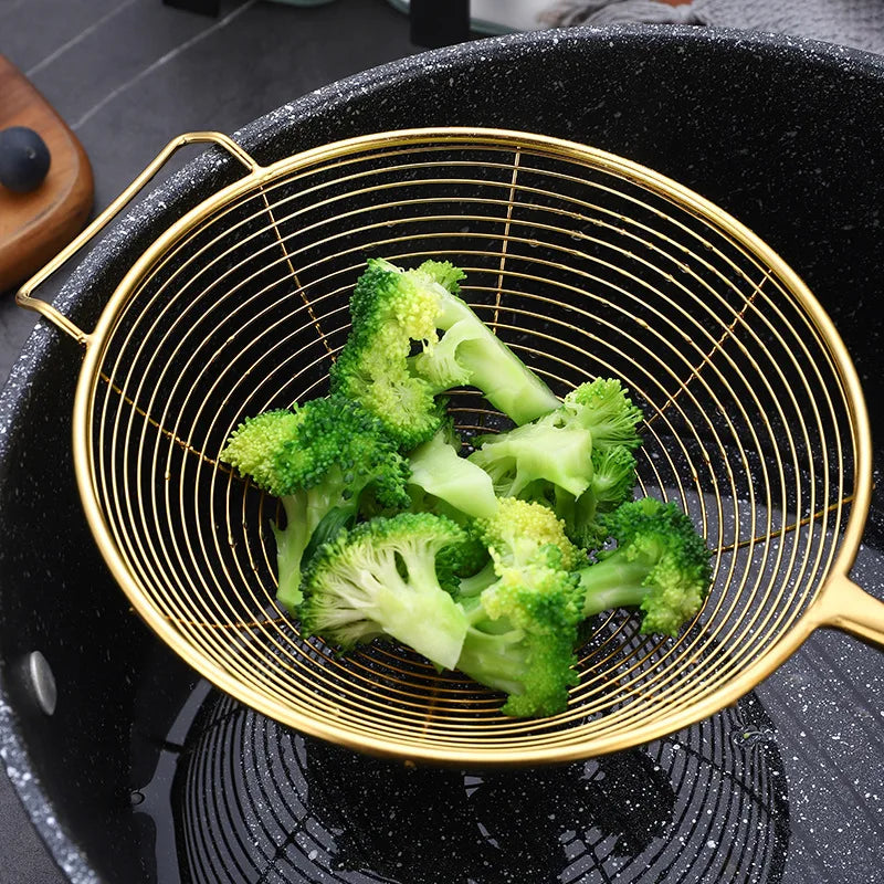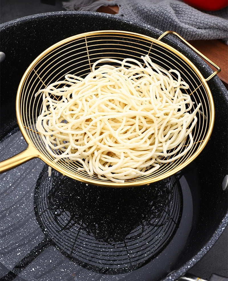 Scoop, strain, and fry with ease using the Golden Stainless Steel Skimmer Strainer Colander Oil Filter Frying Scoop. Its long handle and durable material make it the perfect tool for draining hot noodles, dumplings, and more. Plus, its golden color adds a touch of elegance to any kitchen.