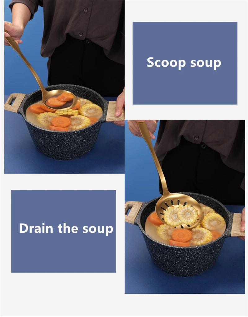 Upgrade your kitchen with these stylish and functional stainless steel utensils. The golden finish and unique pattern add a touch of elegance to your cooking experience. Hang them for easy access and keep your kitchen looking sleek and organized. Perfect for all your cooking needs.